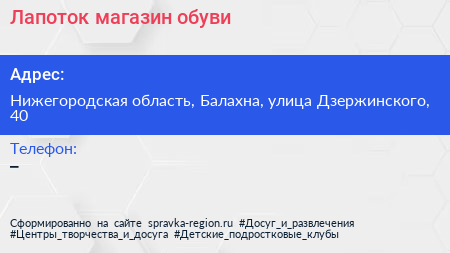 Лапоток, магазин обуви по адресу Нижегородская область, Балахна, улица Дзержинского, 40 в дальнейшем Организация, размещена в следующих категориях: