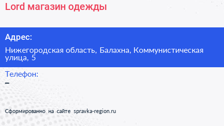 Lord, магазин одежды по адресу Нижегородская область, Балахна, Коммунистическая улица, 5 в дальнейшем Организация, размещена в следующих категориях: