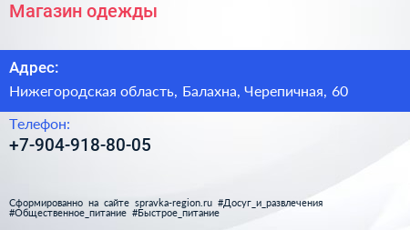 Магазин одежды по адресу Нижегородская область, Балахна, Черепичная, 60 в дальнейшем Организация, размещена в следующих категориях: