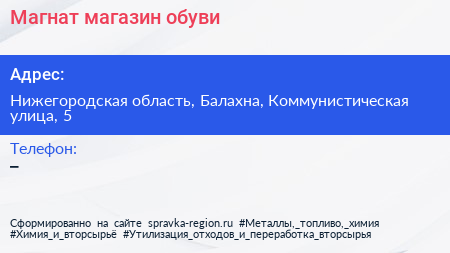 Магнат, магазин обуви по адресу Нижегородская область, Балахна, Коммунистическая улица, 5 в дальнейшем Организация, размещена в следующих категориях: