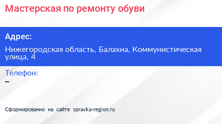 Мастерская по ремонту обуви по адресу Нижегородская область, Балахна, Коммунистическая улица, 4 в дальнейшем Организация, размещена в следующих категориях: