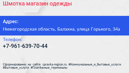 Шмотка, магазин одежды по адресу Нижегородская область, Балахна, улица Горького, 34а в дальнейшем Организация, размещена в следующих категориях: