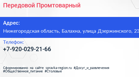 Передовой Промтоварный по адресу Нижегородская область, Балахна, улица Дзержинского, 23 в дальнейшем Организация, размещена в следующих категориях: