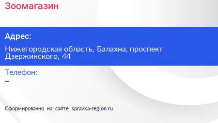 Зоомагазин по адресу Нижегородская область, Балахна, проспект Дзержинского, 44 в дальнейшем Организация, размещена в следующих категориях: