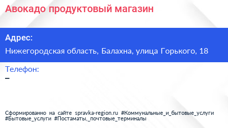 Авокадо, продуктовый магазин по адресу Нижегородская область, Балахна, улица Горького, 18 в дальнейшем Организация, размещена в следующих категориях: