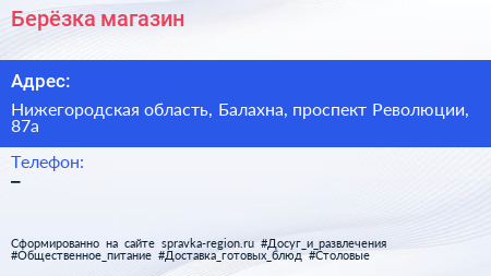 Берёзка, магазин по адресу Нижегородская область, Балахна, проспект Революции, 87а в дальнейшем Организация, размещена в следующих категориях: