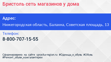Бристоль, сеть магазинов у дома по адресу Нижегородская область, Балахна, Советская площадь, 13 в дальнейшем Организация, размещена в следующих категориях: