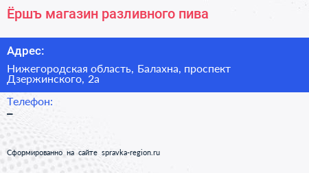 Ёршъ, магазин разливного пива по адресу Нижегородская область, Балахна, проспект Дзержинского, 2а в дальнейшем Организация, размещена в следующих категориях: