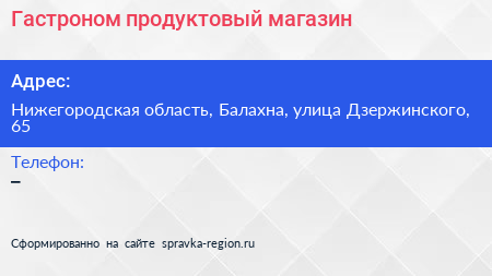 Гастроном, продуктовый магазин по адресу Нижегородская область, Балахна, улица Дзержинского, 65 в дальнейшем Организация, размещена в следующих категориях:
