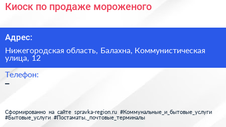 Киоск по продаже мороженого по адресу Нижегородская область, Балахна, Коммунистическая улица, 12 в дальнейшем Организация, размещена в следующих категориях: