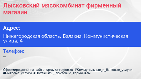 Лысковский мясокомбинат, фирменный магазин по адресу Нижегородская область, Балахна, Коммунистическая улица, 4 в дальнейшем Организация, размещена в следующих категориях:
