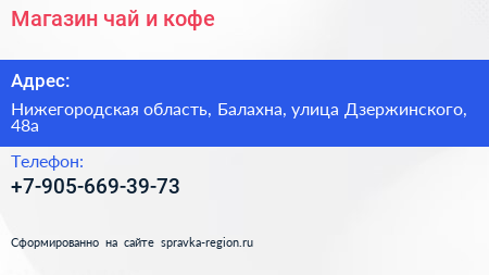Магазин чай и кофе по адресу Нижегородская область, Балахна, улица Дзержинского, 48а в дальнейшем Организация, размещена в следующих категориях: