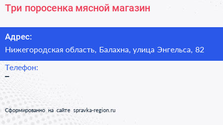 Три поросенка, мясной магазин по адресу Нижегородская область, Балахна, улица Энгельса, 82 в дальнейшем Организация, размещена в следующих категориях: