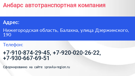 Анбарс, автотранспортная компания по адресу Нижегородская область, Балахна, улица Дзержинского, 190 в дальнейшем Организация, размещена в следующих категориях: