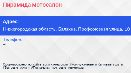 Пирамида, мотосалон по адресу Нижегородская область, Балахна, Профсоюзная улица, 10 в дальнейшем Организация, размещена в следующих категориях: