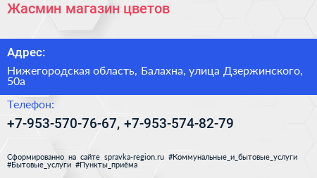 Жасмин, магазин цветов по адресу Нижегородская область, Балахна, улица Дзержинского, 50а в дальнейшем Организация, размещена в следующих категориях:
