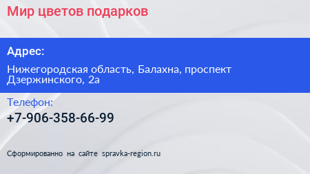 Мир цветов подарков по адресу Нижегородская область, Балахна, проспект Дзержинского, 2а в дальнейшем Организация, размещена в следующих категориях: