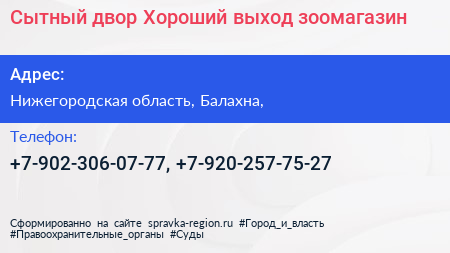 Сытный двор & Хороший выход, зоомагазин по адресу Нижегородская область, Балахна, в дальнейшем Организация, размещена в следующих категориях:
