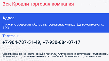 Век Кровли, торговая компания по адресу Нижегородская область, Балахна, улица Дзержинского, 190 в дальнейшем Организация, размещена в следующих категориях: