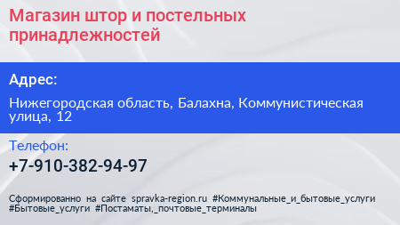 Магазин штор и постельных принадлежностей по адресу Нижегородская область, Балахна, Коммунистическая улица, 12 в дальнейшем Организация, размещена в следующих категориях: