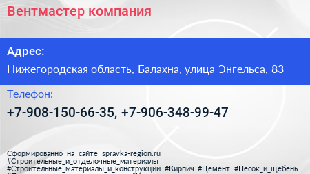 Вентмастер, компания по адресу Нижегородская область, Балахна, улица Энгельса, 83 в дальнейшем Организация, размещена в следующих категориях: