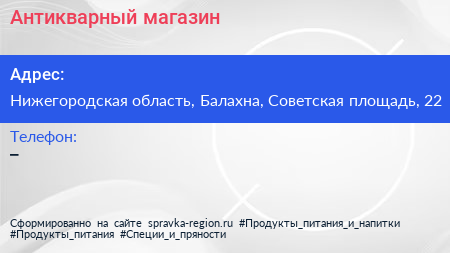 Антикварный магазин по адресу Нижегородская область, Балахна, Советская площадь, 22 в дальнейшем Организация, размещена в следующих категориях: