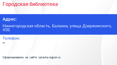Городская библиотека по адресу Нижегородская область, Балахна, улица Дзержинского, 45Б в дальнейшем Организация, размещена в следующих категориях: