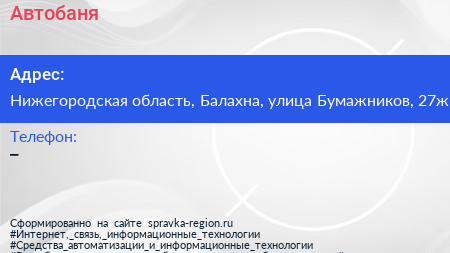 Автобаня по адресу Нижегородская область, Балахна, улица Бумажников, 27ж в дальнейшем Организация, размещена в следующих категориях: