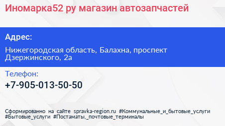 Иномарка52.ру, магазин автозапчастей по адресу Нижегородская область, Балахна, проспект Дзержинского, 2а в дальнейшем Организация, размещена в следующих категориях: