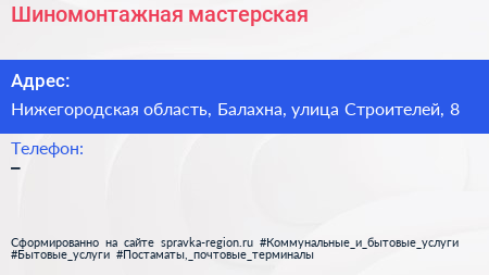 Шиномонтажная мастерская по адресу Нижегородская область, Балахна, улица Строителей, 8 в дальнейшем Организация, размещена в следующих категориях:
