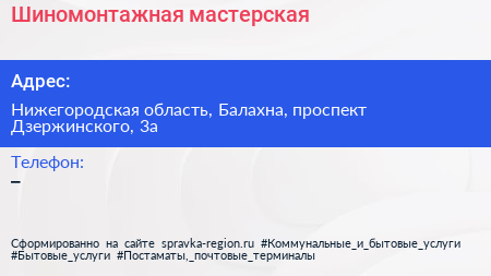 Шиномонтажная мастерская по адресу Нижегородская область, Балахна, проспект Дзержинского, 3а в дальнейшем Организация, размещена в следующих категориях: