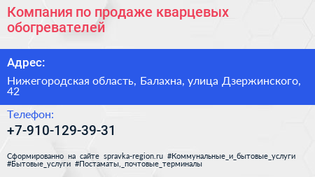 Компания по продаже кварцевых обогревателей по адресу Нижегородская область, Балахна, улица Дзержинского, 42 в дальнейшем Организация, размещена в следующих категориях: