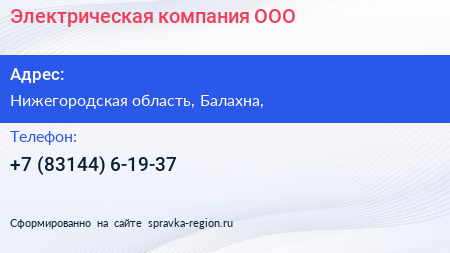 Электрическая компания, ООО по адресу Нижегородская область, Балахна, в дальнейшем Организация, размещена в следующих категориях: