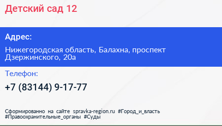 Детский сад №12 по адресу Нижегородская область, Балахна, проспект Дзержинского, 20а в дальнейшем Организация, размещена в следующих категориях: