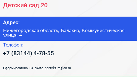 Детский сад №20 по адресу Нижегородская область, Балахна, Коммунистическая улица, 4 в дальнейшем Организация, размещена в следующих категориях: