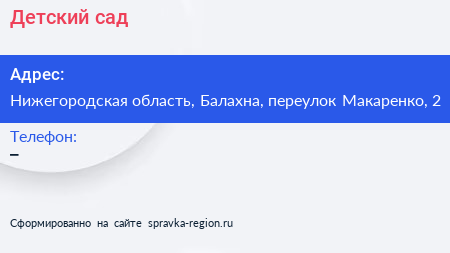 Детский сад по адресу Нижегородская область, Балахна, переулок Макаренко, 2 в дальнейшем Организация, размещена в следующих категориях: