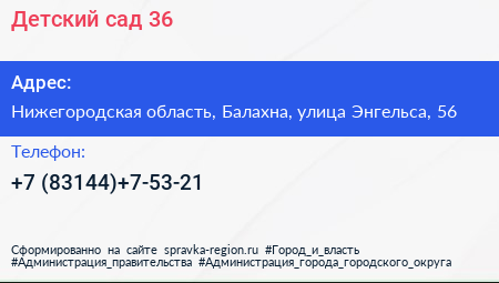Детский сад №36 по адресу Нижегородская область, Балахна, улица Энгельса, 56 в дальнейшем Организация, размещена в следующих категориях:
