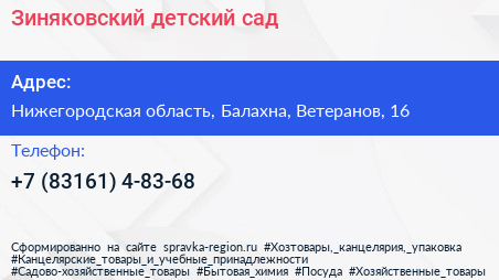Зиняковский детский сад по адресу Нижегородская область, Балахна, Ветеранов, 16 в дальнейшем Организация, размещена в следующих категориях: