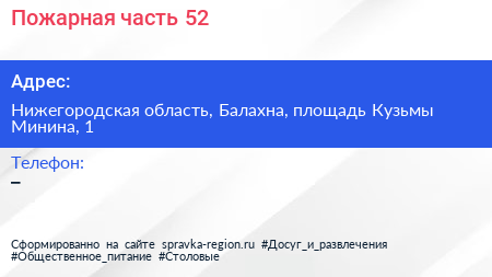 Пожарная часть №52 по адресу Нижегородская область, Балахна, площадь Кузьмы Минина, 1 в дальнейшем Организация, размещена в следующих категориях:
