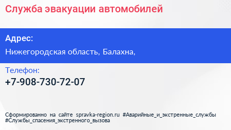 Служба эвакуации автомобилей по адресу Нижегородская область, Балахна, в дальнейшем Организация, размещена в следующих категориях: