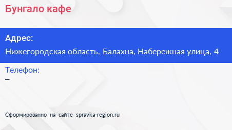 Бунгало, кафе по адресу Нижегородская область, Балахна, Набережная улица, 4 в дальнейшем Организация, размещена в следующих категориях: