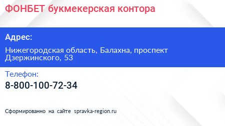 ФОНБЕТ, букмекерская контора по адресу Нижегородская область, Балахна, проспект Дзержинского, 53 в дальнейшем Организация, размещена в следующих категориях:
