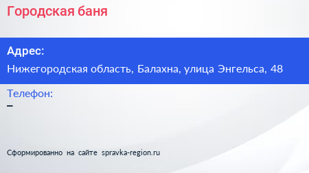 Городская баня по адресу Нижегородская область, Балахна, улица Энгельса, 48 в дальнейшем Организация, размещена в следующих категориях: