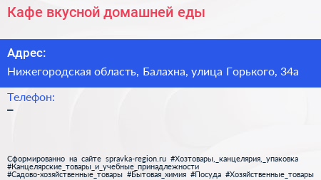 Кафе вкусной домашней еды по адресу Нижегородская область, Балахна, улица Горького, 34а в дальнейшем Организация, размещена в следующих категориях: