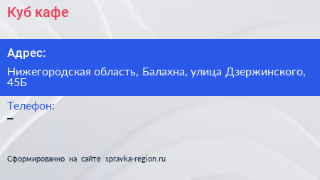Куб, кафе по адресу Нижегородская область, Балахна, улица Дзержинского, 45Б в дальнейшем Организация, размещена в следующих категориях: