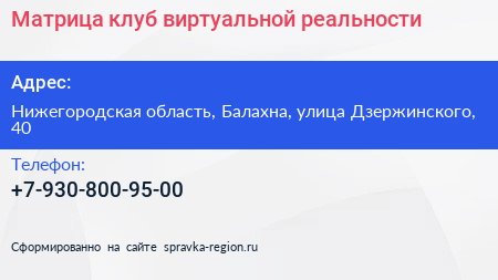 Матрица, клуб виртуальной реальности по адресу Нижегородская область, Балахна, улица Дзержинского, 40 в дальнейшем Организация, размещена в следующих категориях: