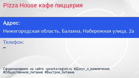 Pizza House, кафе-пиццерия по адресу Нижегородская область, Балахна, Набережная улица, 2а в дальнейшем Организация, размещена в следующих категориях: