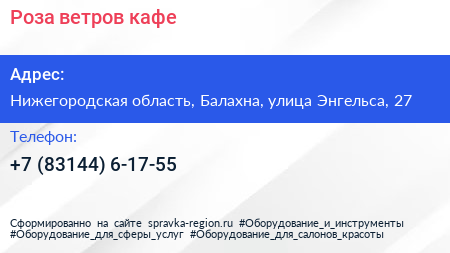 Роза ветров, кафе по адресу Нижегородская область, Балахна, улица Энгельса, 27 в дальнейшем Организация, размещена в следующих категориях: