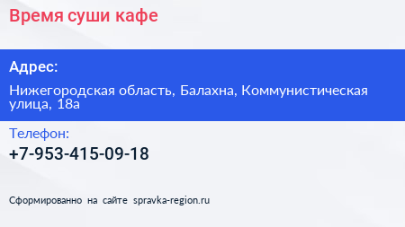 Время суши, кафе по адресу Нижегородская область, Балахна, Коммунистическая улица, 18а в дальнейшем Организация, размещена в следующих категориях: