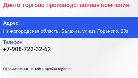 Динго, торгово-производственная компания по адресу Нижегородская область, Балахна, улица Горького, 23а в дальнейшем Организация, размещена в следующих категориях: